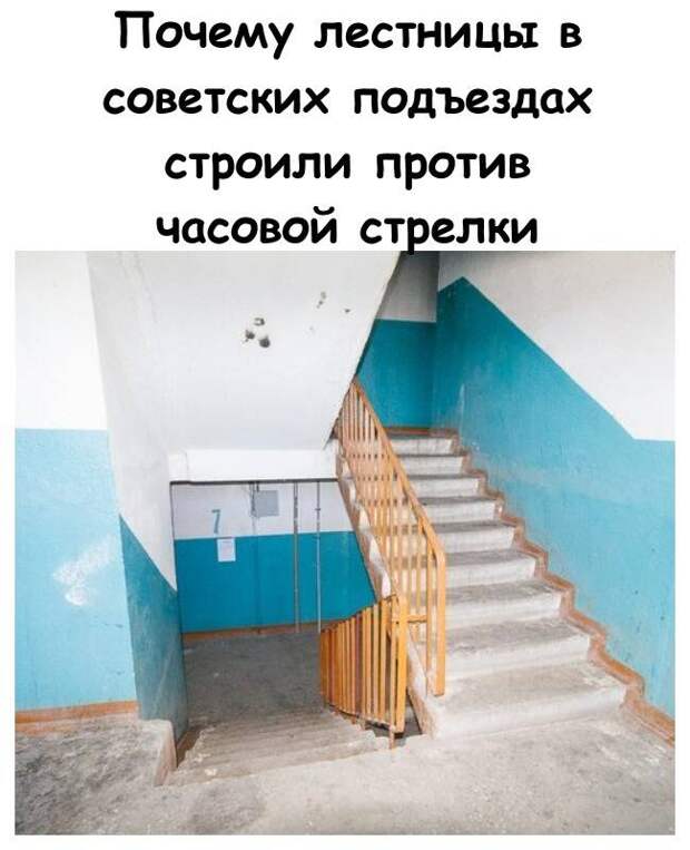 Лестницы в советских подъездах чаще строили против часовой стрелки не из-за военных хитростей или строгого норматива, а из-за удобства. Хочется верить, что кто-то все же подумал о населении, большая часть которого правши, и чтобы им было удобно спускаться в экстренном случае.