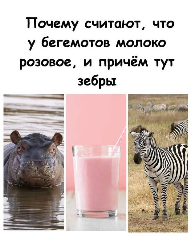 История с бегемотами оказалась настолько вирусной, что «розовое молоко» приписали и зебрам. А почему бы и нет? Ведь точатся споры о том, черные они в белую полоску или наоборот, так почему бы не добавить ещё один миф.