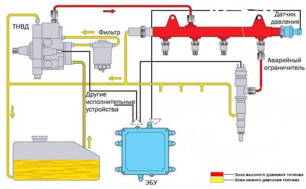 Из рейки топливо подается к форсункам, которые управляются электронным блоком управления двигателем. ЭБУ анализирует данные от множества датчиков (положения коленвала, температуры, нагрузки, давления воздуха) и на основе этих данных точно определяет, когда открыть форсунку, на какое время и какое количество топлива впрыснуть в цилиндр.