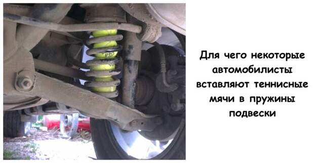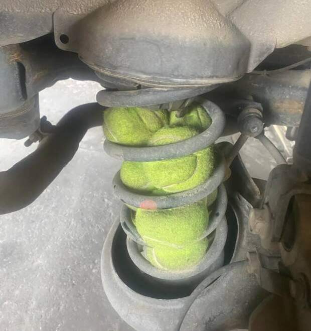 Итак, как это выглядит: берут несколько теннисных мячей и помещают их внутрь витков пружины подвески. Иногда мячи немного подрезают или делают отверстие, чтобы они не выскакивали.