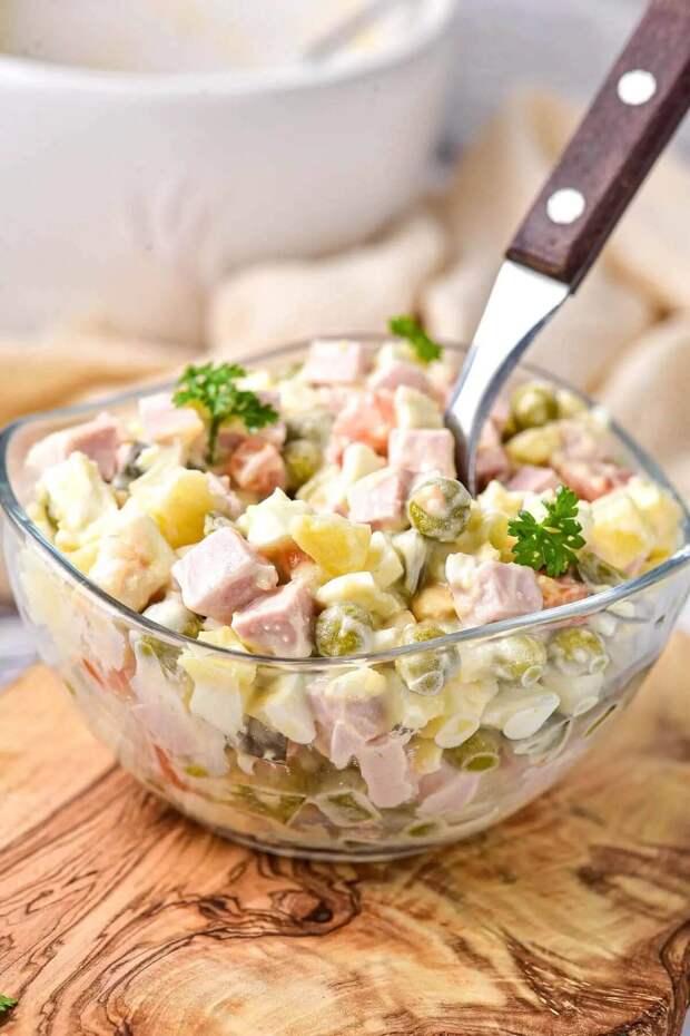 Этот салат за более чем сто лет существования стал настоящим символом Нового года. Но от своего прародителя он ушел очень далеко. Оригинальный рецепт Люсьена Оливье, владельца московского ресторана «Эрмитаж», в XIX веке был ассорти из деликатесов: рябчики, телячий язык, паюсная икра, раковые шейки, каперсы, корнишоны и оливки.