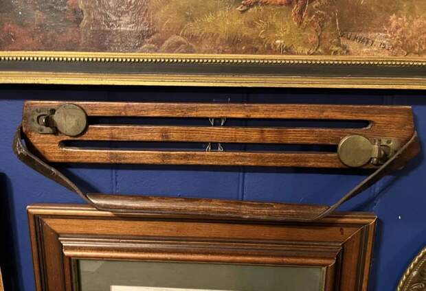 10. Эта деревянная штука с двумя латунными кольцами и кожаной/деревянной ручкой висит в пабе в сельской части Англии. Длина около 30 см. Кто-то знает, что это?