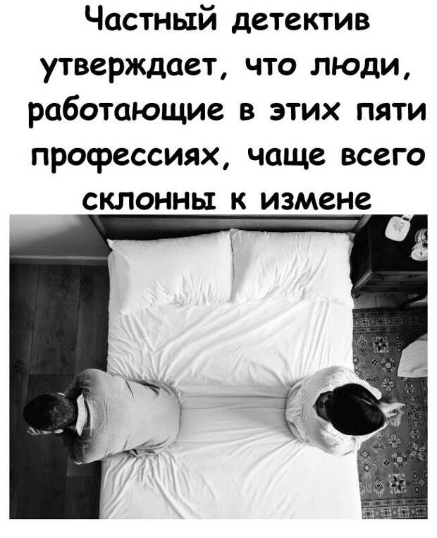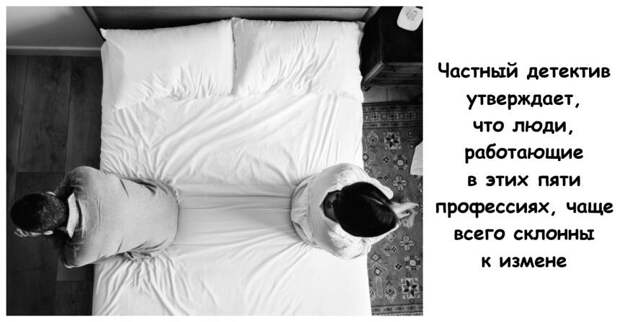 Частный детектив перечислил пять профессий, представители которых, по его мнению, наиболее склонны к изменам. Он знает, о чём говорит, ведь большая часть его работы связана с разоблачением изменщиков. Конечно, это всего лишь наблюдения и определенные закономерности, подмеченные частным детективом. Если ваш партнер работает в одной из следующих профессий - это не значит, что он обязательно будет изменить.