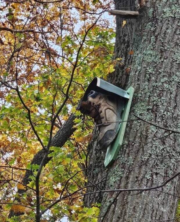 11. Вот такая находка нас ждала на дереве на туристической тропе: большой походный ботинок на табличке с «крышей». Что бы это значило?