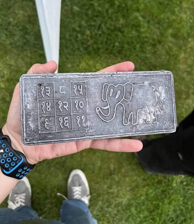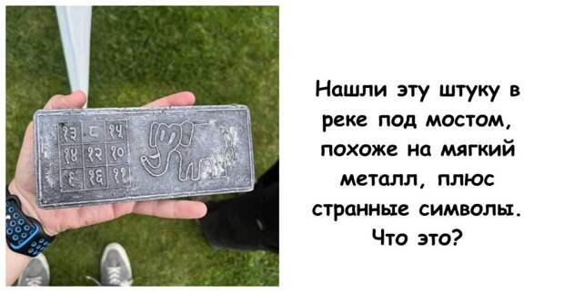 15. Нашли эту штуку в реке под мостом, похоже на мягкий металл, плюс странные символы. Что это?